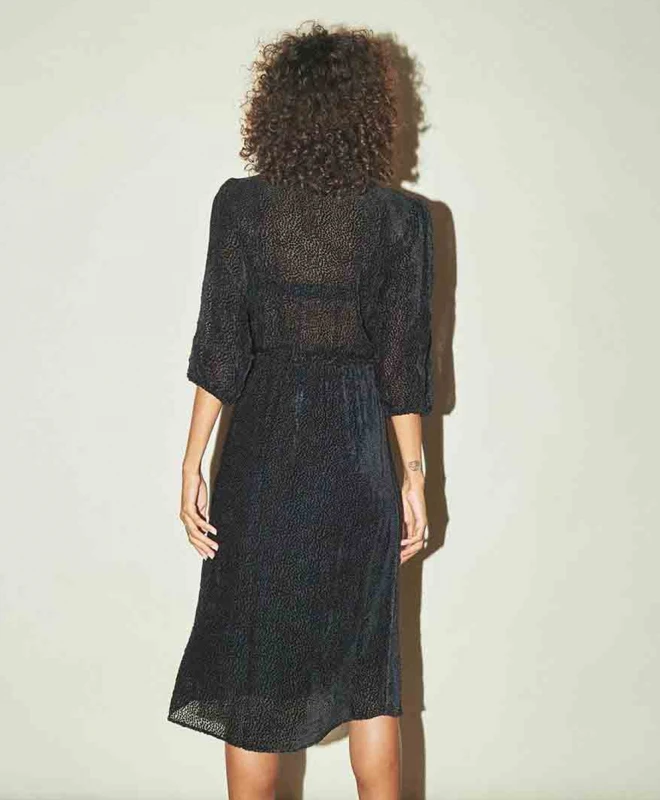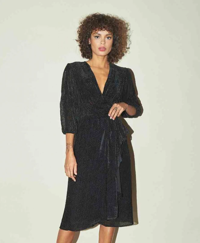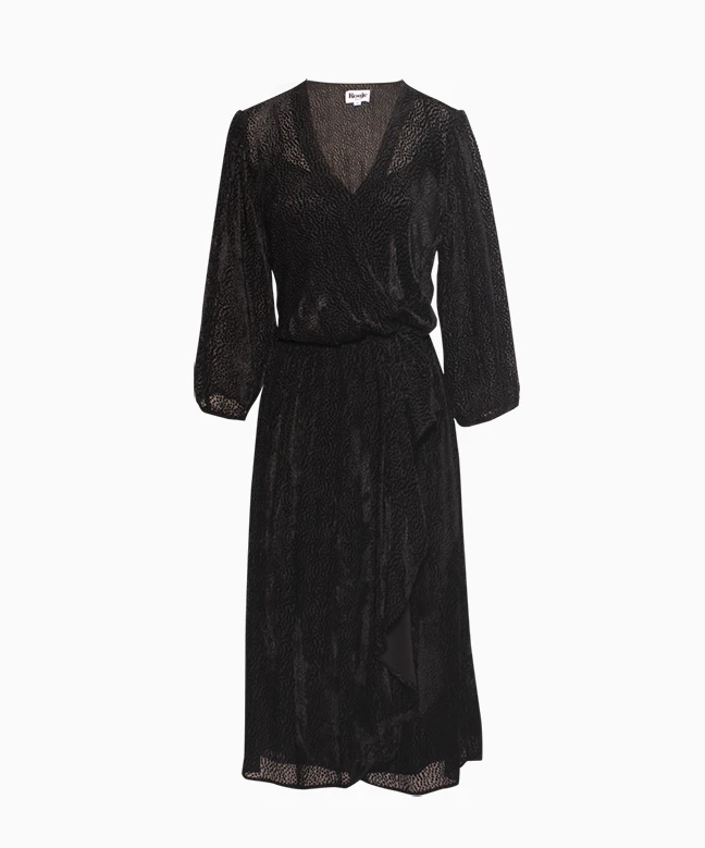 Robe ROUJE, modèle BARBARA. Un fabuleux cocktail d’ingrédients flateurs : les manches ballons qui affinent les bras, le cache-coeur qui sublime le décolleté et marque la taille, et la longueur midi pour dévoiler les chevilles. Profitez en dès maintenant et louez cette pièce unique en son genre.