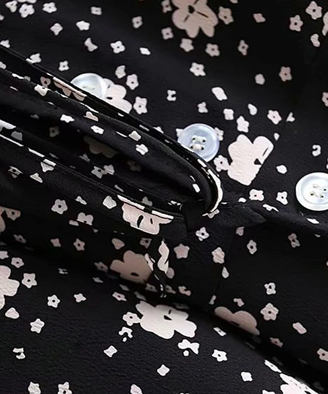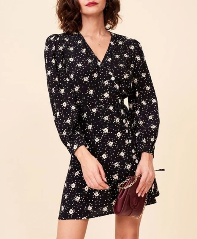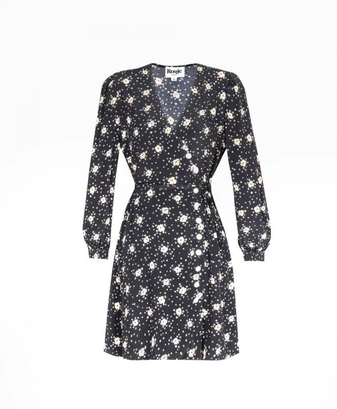 Robe ROUJE, modèle Gabinette. Cette robe noire à imprimé fleuris est un incontournable de la garde-robe. Cette robe à la coupe midi, portefeuille est composée d’un col V, de manches longues ainsi que d’un boutonnage sur le côté. Associez cette robe à une paire de bottines basses pour un look chic et habillé. Cette pièce est disponible à l’abonnement.