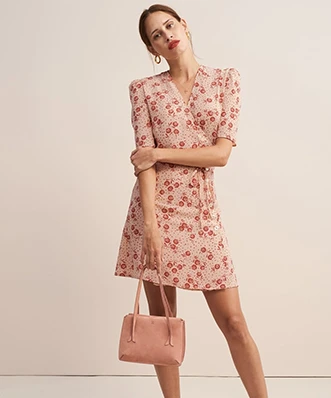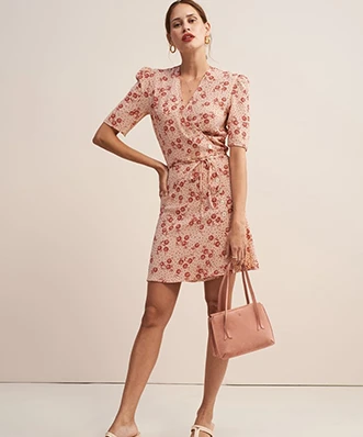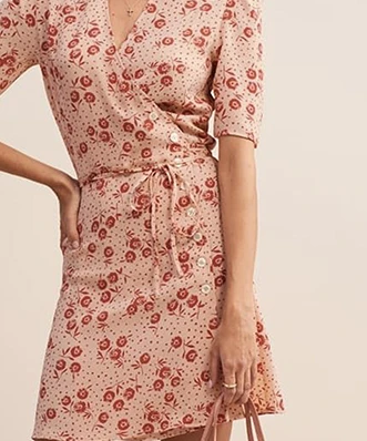 Robe Rouje, modèle Gabinette Tournesol Rose. Cette robe dispose de manches courtes, coupées au-dessus des coudes. Les épaules sont surélevées. Cette robe porte-feuille possède un col. Une ceinture intégrée viendra marquer votre taille et fermer la robe. Aussi, une boutonnière est positionnée sur la hanche gauche. Cette petite robe fluide et légère sera parfaite pour les piques niques du dimanche après-midi du mois de juin. Associez-la à une simple paire de baskets blanches et plates pour un look décontracté. Cette robe Rouje est disponible à la location par abonnement Une Robe Un soir et à la location à l’unité.