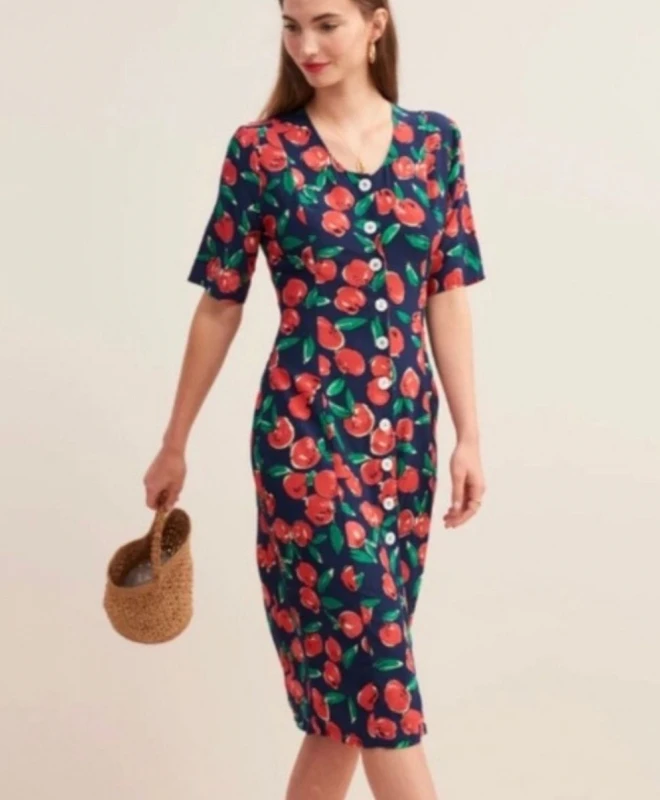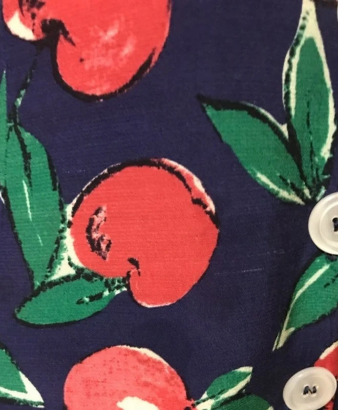 Robe Rouje Modèle Mathilda Cerises Bleus. La robe longueur sous les genoux dispose d’une encolure arrondie. Elle possède également des boutons blancs sur toute la longueur. De fond bleu marine, elle est entièrement ornée de cerises rouges. On aime particulièrement la robe Mathilda pour sa coupe vintage et féminine. Elle est disponible à la location pour tout abonnement Une Robe Un Soir ou à la location unitaire.