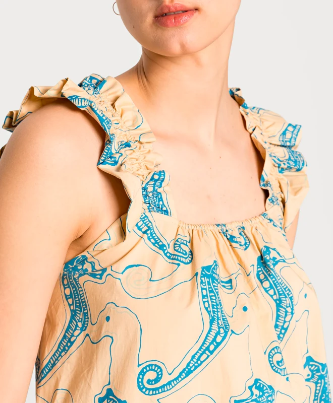 Robe Samsoe Samsoe, modèle Gill Aqua Seahorse. Cette jolie robe midi imprimée sans manches avec une silhouette décontractée dispose de bretelles froncées et volantées. Cette robe longue sera parfaite pour vos vacances en bord de mer ou simplement pour les journées chaudes du printemps ! Cette pièce Samsoe Samsoe est disponible à la location grâce à votre abonnement à la box Une Robe Un Soir ou à la location unitaire.