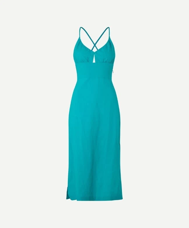 Robe Samsoe Samsoe, modèle Holly. Cette robe longue au dos nu dispose de bretelles à nouer et une encolure froncée. Idéale pour la saison estivale, cette jolie bleue robe peut s’associer à une paire de sandales à talons, pour une soirée entre amis. Cette robe Samsoe Samsoe est disponible en location a l’unité ou avec l’abonnement à la box Une Robe Un Soir.