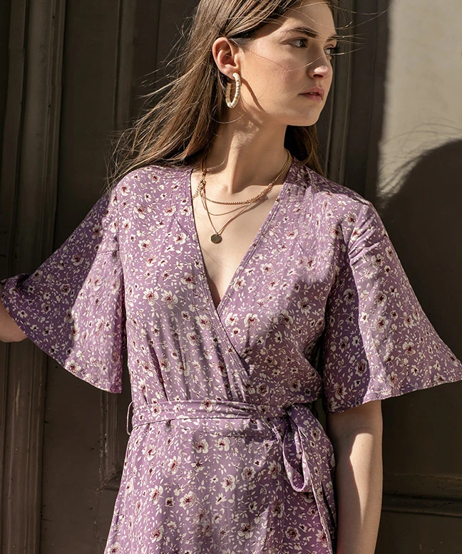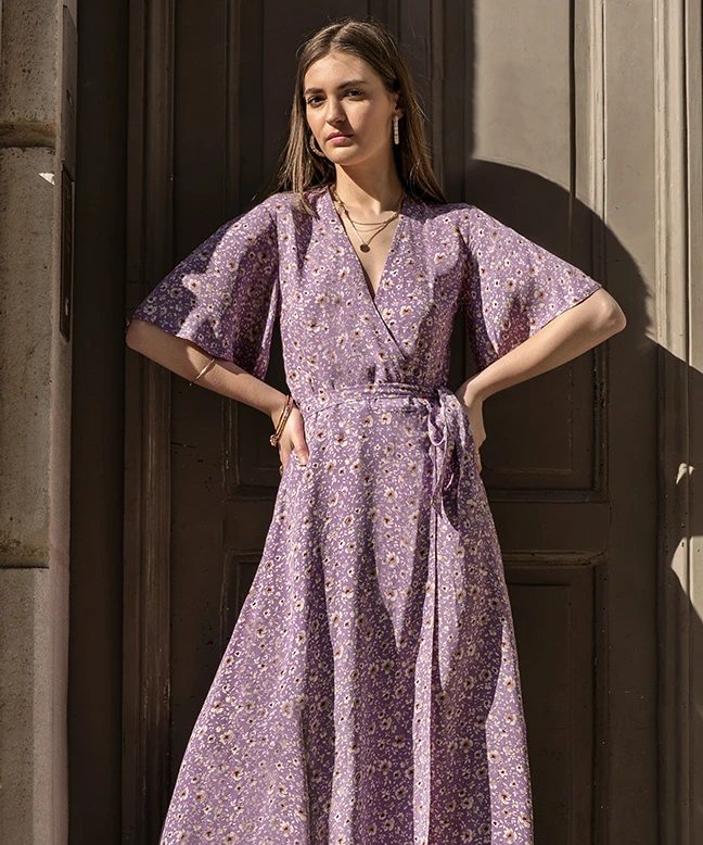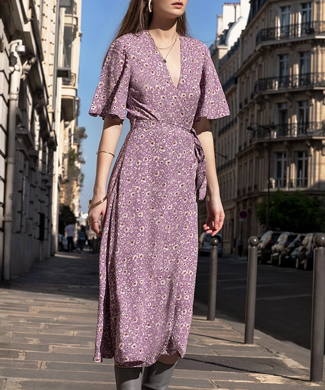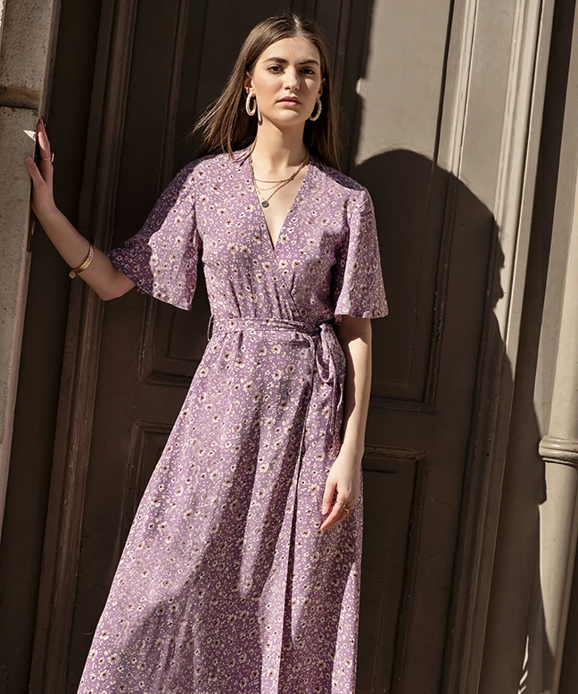 Robe Samsoe Samsoe modèle Melody. Cette robe longue violette à motifs fleuris dispose de manches courtes et d’un décolleté. Elle est cintrée à la taille. On aime particulièrement sa forme et ses motifs féminins et élégants. Profitez d’un large choix de robes fleuries disponible à la location pour tout abonnement Une Robe Un Soir.
