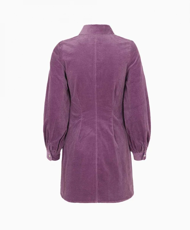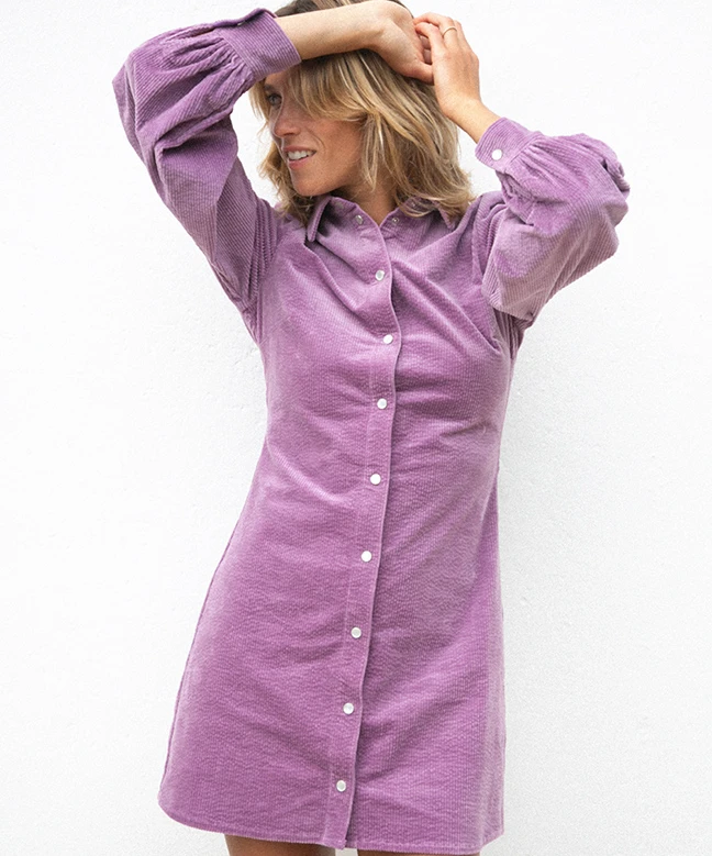 Robe Samsoe Samsoe, modèle Moonstone. Cette robe chemise courte est en velours côtelé issu d’un coton biologique. La robe dispose d’une couleur violette à la taille ajustée et une silhouette légèrement en A. Elle est composée de manches volumineuses avec poignets à fronces, d’un col pointu soigné et une fermeture par bouton pression. Changer de robes tous les mois, c’est désormais possible grâce à la location de vêtements.