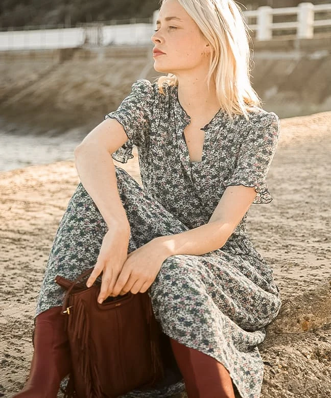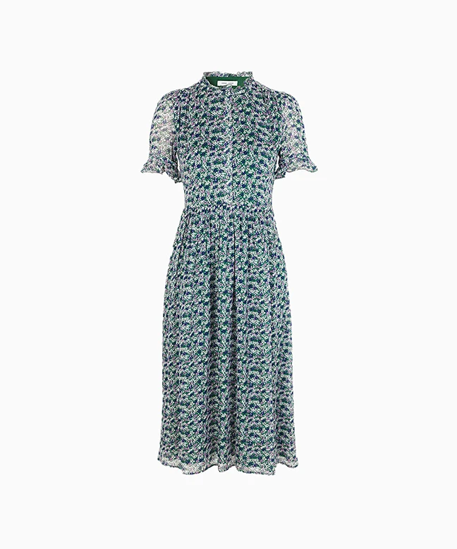 Robe SAMSØE & SAMSØE modèle Rosella. Cette petite robe imprimé fleuri rappel un jardin en pleine floraison, cette robe imprimée est cintrée à la taille pour montrer votre forme. La robe à louer dispose d’une finition avec une patte boutonnée et des volants souples sur le col et les manches.