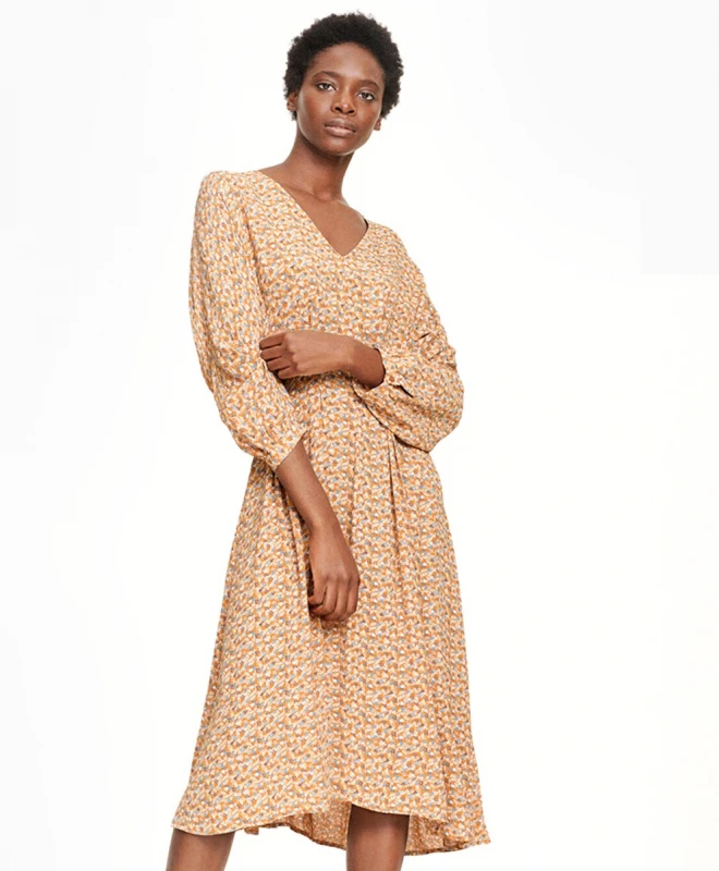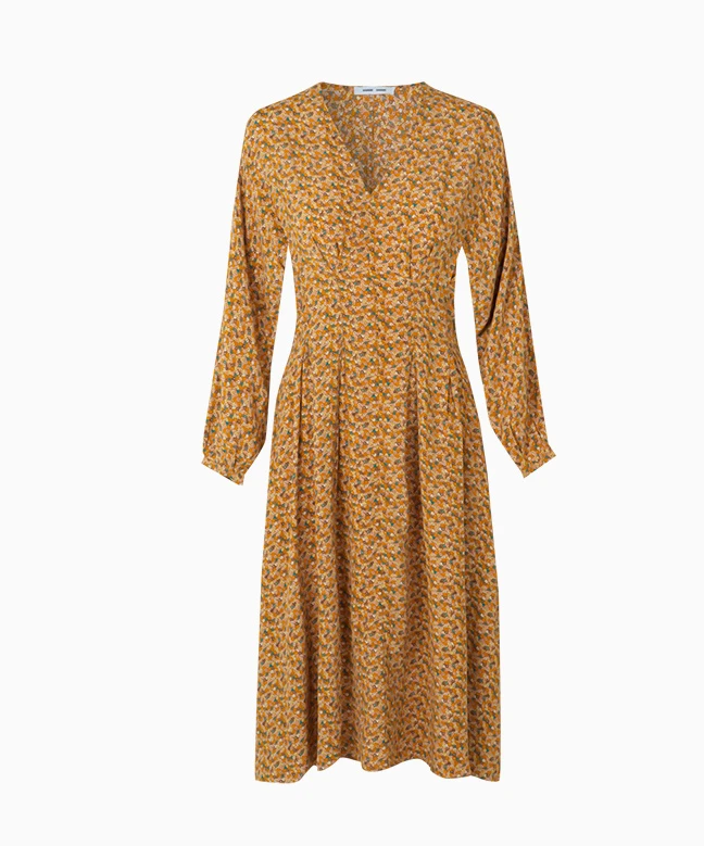 Robe Samsoe-Samose, modèle Valentina. Cette robe à imprimé, avec son col en V, ses manches amples et longues est un produit typiquement Samsoe. On peut aussi bien la porter en été qu’en hiver. Une robe de choix lors de sortie en famille ou entre amis le week-end. Associez-la d’une veste en jean ou en cuir pour faire un contraste avec la pièce. Une robe à glisser dans votre box de location de vêtements si vous recherchez un modèle à imprimé de saison.