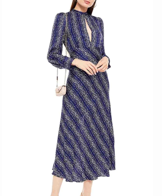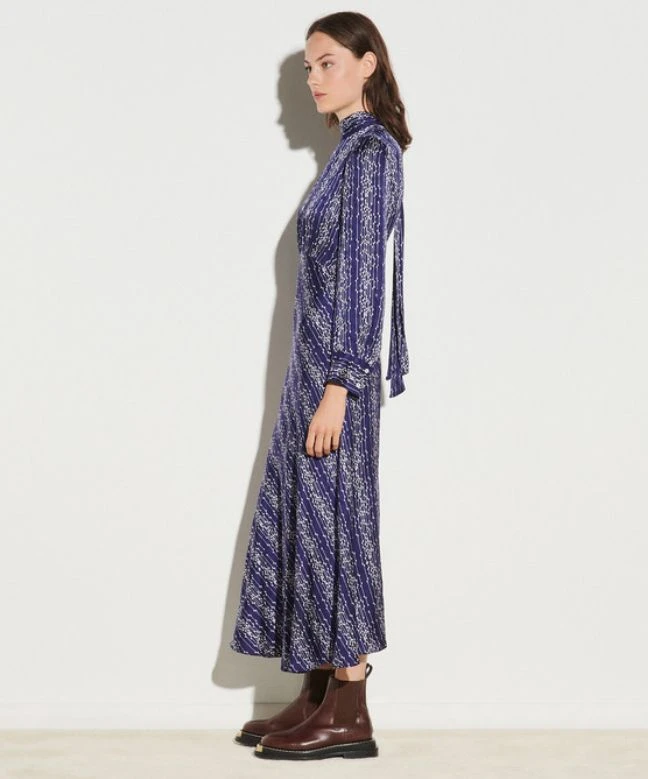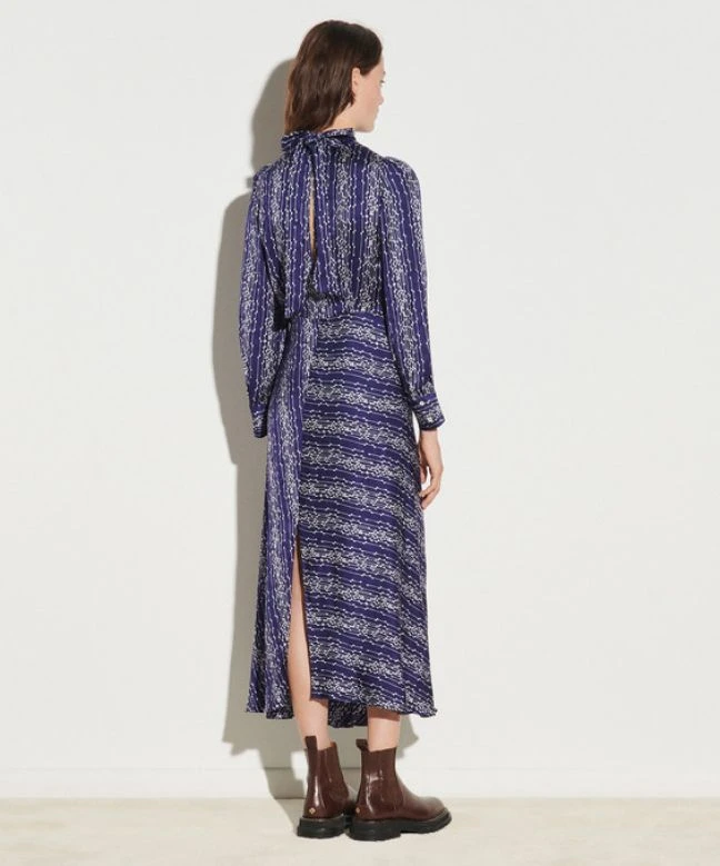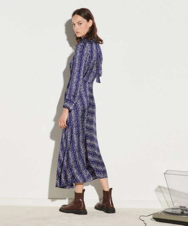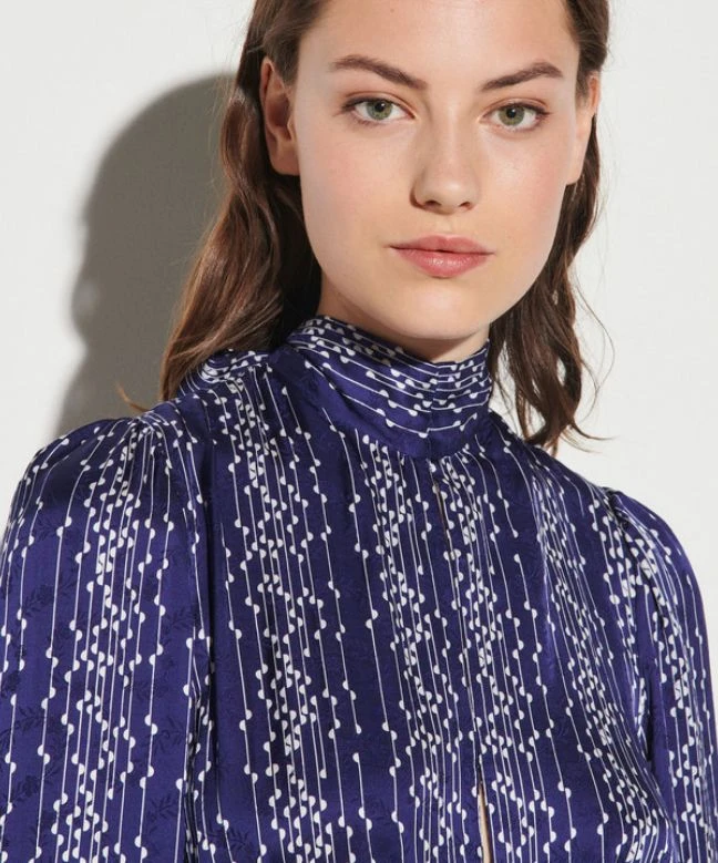 Robe Sandro, modèle Angie Satin. Cette robe longue Sandro de couleur bleu nuit est dotée d’un col montant et ouvert sur le buste. Les manches sont resserrées au niveau des poignets grâce à des boutons blancs rappelant le motif floral de la robe. Fendue sur le derrière, la robe est parfaite pour une soirée professionnelle. Cette robe Sandro est disponible à la location par abonnement Une Robe Un soir et aussi à la location à l’unité.