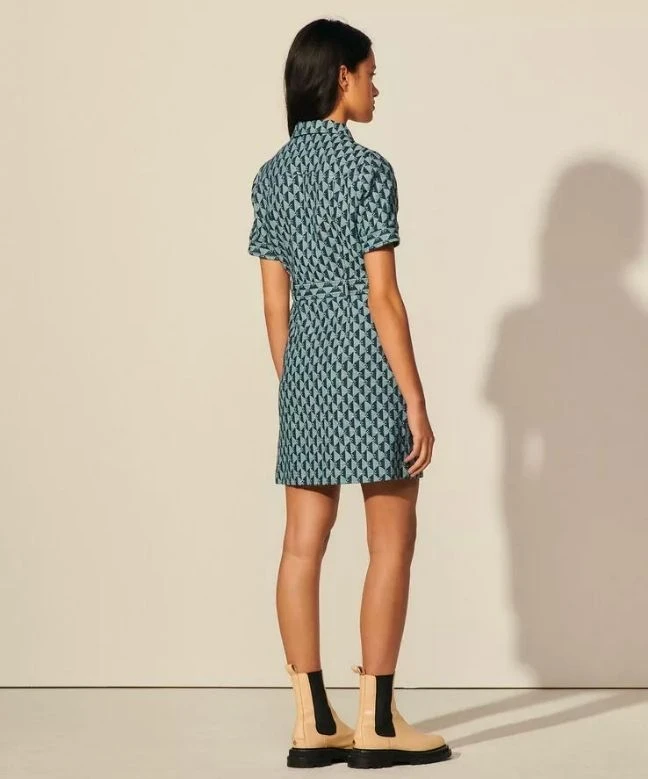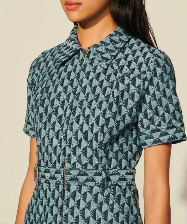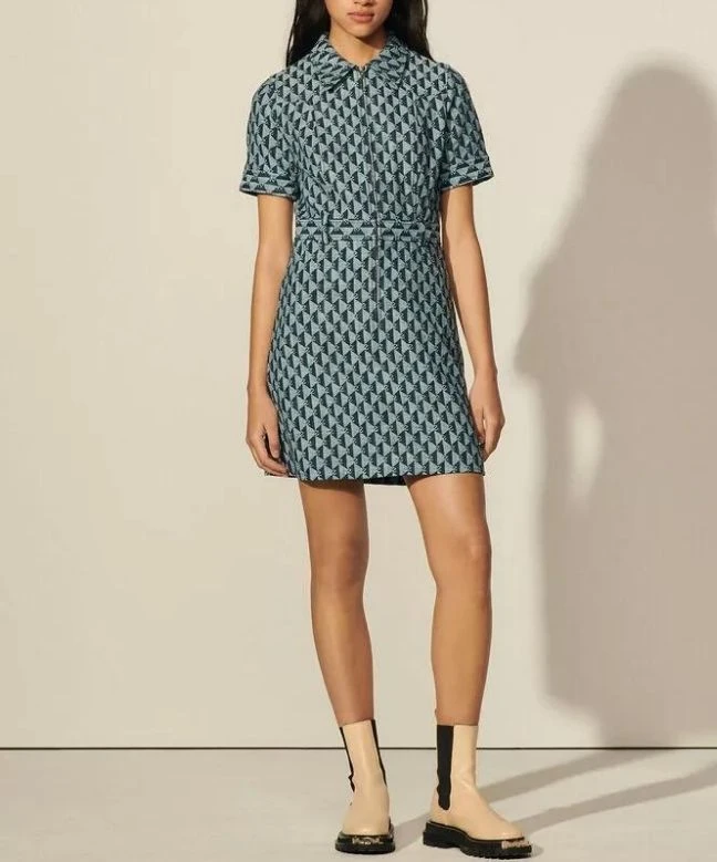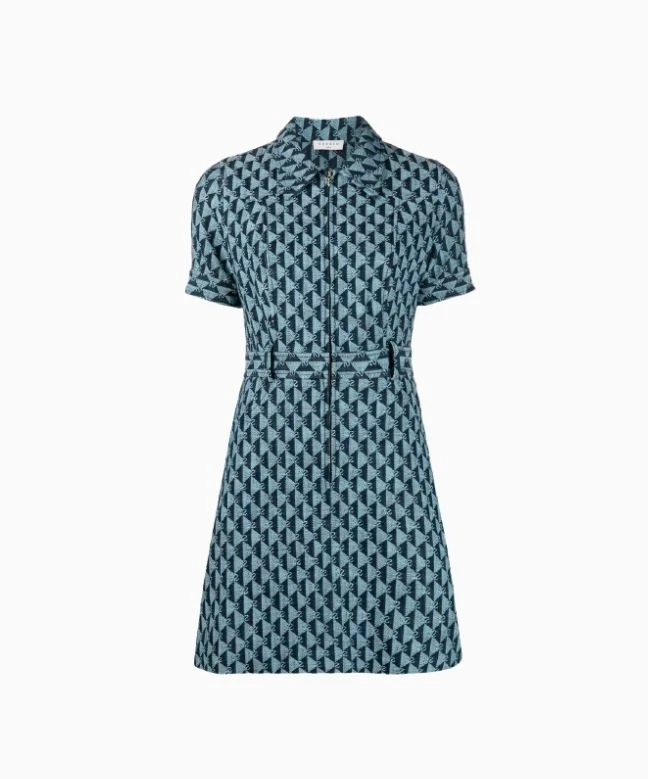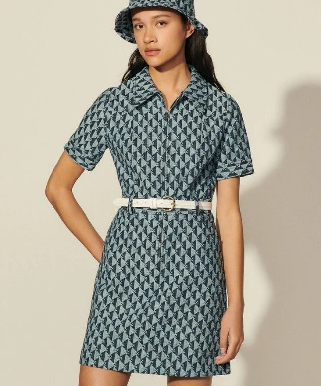 Robe Sandro, modèle double S jacquard. Cette robe en denim de chez Sandro dispose d’un imprimé monogramme bleu foncé sur l’ensemble de la robe. Ce col classique est orné d’une fermeture éclair qui descend jusqu’au niveau des hanches et de manches courtes. Cette robe Sandro est disponible à la location unitaire ou avec l’abonnement Une Robe Un Soir.