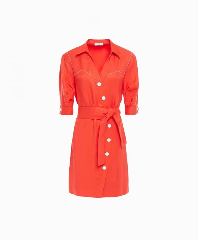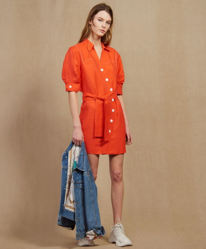 Robe Sandro, modèle Kunga. Cette robe style chemise longue de couleur rouge à l’allure cow-girl moderne dispose de manche arrivant au coude, d’un col italien ainsi que des boutons blancs incurvés et des surpiqûres contrastées le long de l’encolure sur le devant. Elle peut être ceinturée grâce à sa ceinture amovible, pour marquer la taille et avoir une silhouette des plus féminine. Cette pièce peut être portée quotidiennement, pour aller travailler comme lors de vos loisirs.