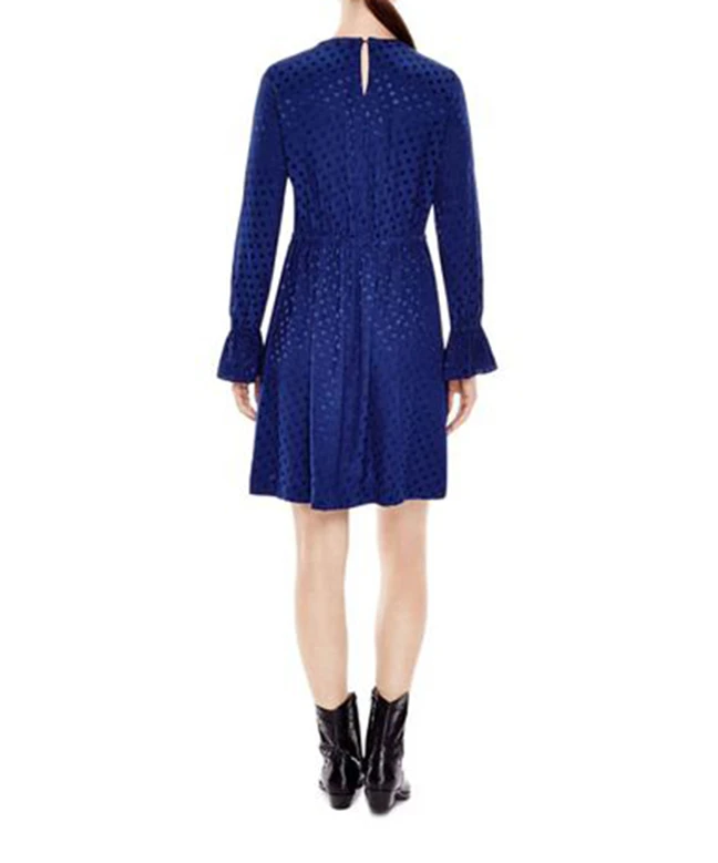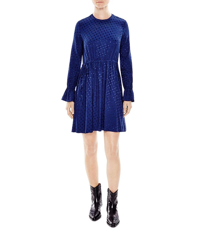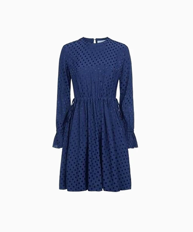 Robe Sandro, modèle Lori. La robe Lori est une robe qui vous appelle à plonger dans le grand bleu ! La couleur bleu marine très propfonde de cette robe saura vous mettre en valeur. Le tissu est contrasté par des motifs à pois bleu foncés qui se fondent dans la couleur initiale. La coupe de la robe est courte avec une jupe plissée, les manches sont longues et peuvent être noués par des liens au poignet. Osez la tendance avec la location unitaire ou l’abonnement Une Robe Un Soir.