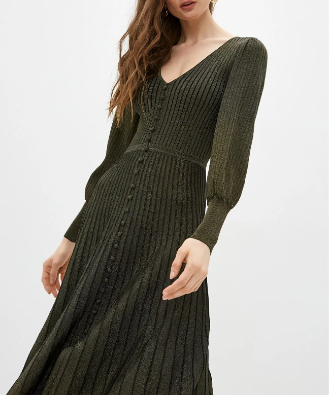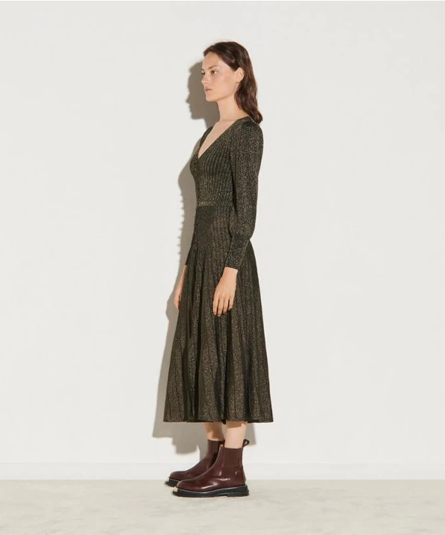 Robe Sandro, modèle Maille Lurex. Cette robe longue en maille lurex de couleur noire et dorée dispose d’un col V, ainsi que de manches bouffantes resserrées sur l’avant des bras. Plissée, la robe dispose également d’une boutonnière le long du buste. La jupe de la robe est évasée vers le bas. Parfaite pour une soirée professionnelle hivernale, cette robe viendra épouser votre silhouette. Vous pouvez la porter avec une paire de talons aiguilles, ainsi qu’un manteau long de couleur noire. Cette robe Sando est disponible à la location par abonnement, Une Robe Un soir et aussi à la location.