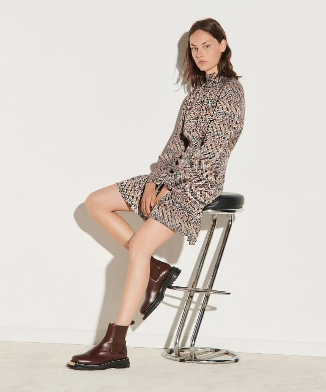Robe Sandro, modèle Sanel. Cette belle robe aux imprimés unique possède deux manches longues resserrées au poignet par deux boutons. Elle dispose d’un col haut et d’une jupe courte dotée de belles fronces qui apporteront du volume. Cintrée à la taille par une ceinture, elle viendra souligner votre silhouette afin de vous mettre en valeur. Elle vous arrivera au-dessus du genou. Cette robe Sandro est disponible à la location par abonnement Une Robe Un Soir et à la location à l’unité.