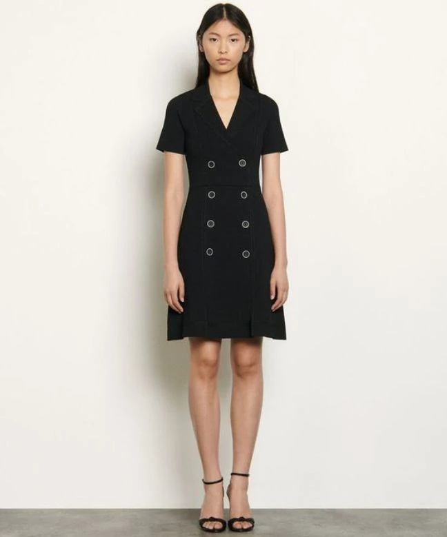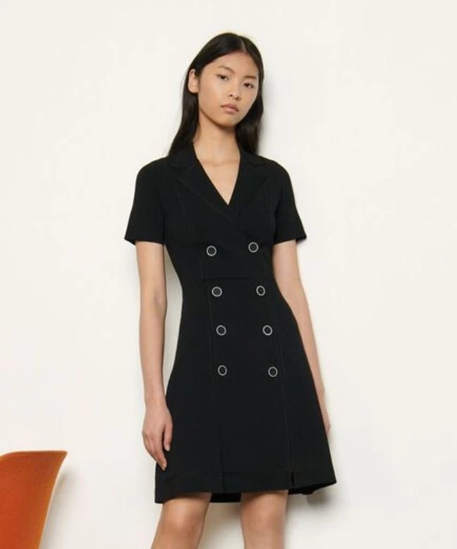 Robe Sandro, modèle Syana. Cette robe courte dispose de manches courtes, et également d’un col V. Elle est dotée d’une boutonnière le long du buste donnant un effet portefeuille à cette robe. La jupe de la robe est évasée. Elégante et casual, vous pouvez la porter en toutes circonstances, aussi bien avec une paie de baskets, qu’une paire de sandales à talons. Cette robe Sandro est disponible à la location par abonnement Une Robe Un soir, et également à la location à l’unité.