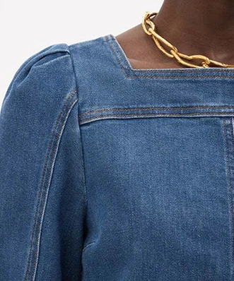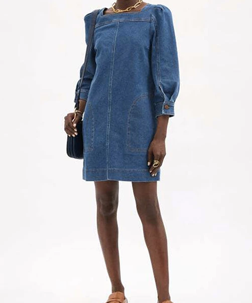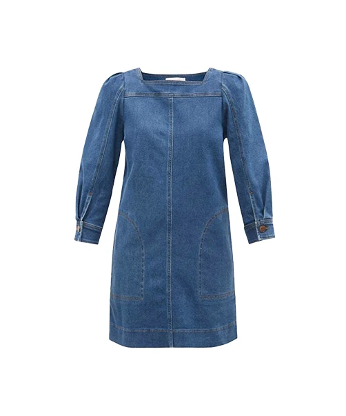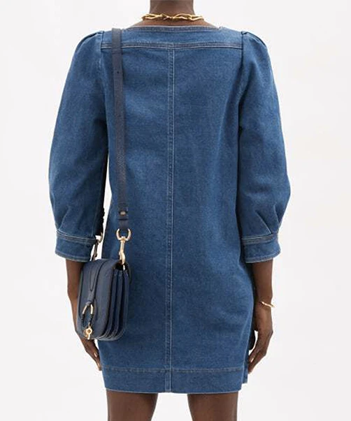 Robe See By Chloé, modele Bleu Navy, Cette robe courte en coton, effet jean dispose de manches longues bouffantes et resserrées au niveau des coudes grâce à une boutonnière. Elle est dotée de plusieurs empiècements au niveau du col carré, mais également au niveau des hanches, disposant ainsi de deux poches. Idéale pour les soirées entre amis, ou pour une simple balade estivale, vous pouvez porter cette robe avec une paire de baskets ou bien des chaussures à talons compensés. Cette robe See By Chloé est disponible à la location par abonnement Une Robe Un soir, et à la location à l’unité.