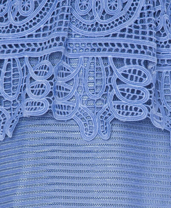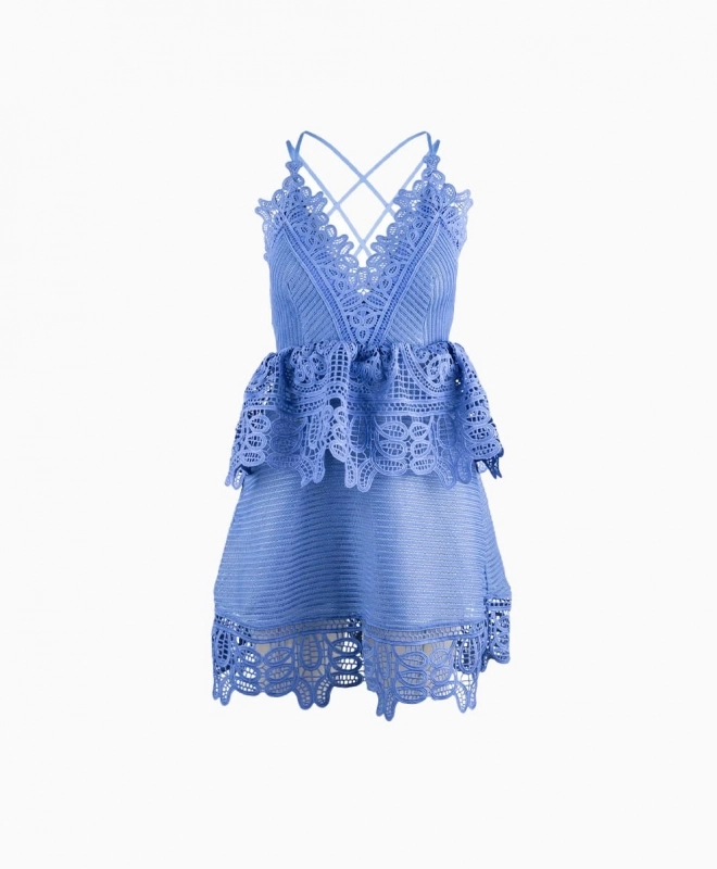 Robe Self Portrait, modèle Lace Peplum Trim. Cette robe courte bleue est conçue avec un corsage en dentelle au crochet et une jupe péplum. Elle présente des bretelles fines à l’avant et un dos croisé. Elle dispose d’une fermeture éclair dissimulée dans le dos. Accompagné d’un sac à main blanc et de boucles d’oreille sobres pour un look léger mais toujours chic, cette robe est disponible à la location pour vous accompagner lors de vos plus beaux événements !