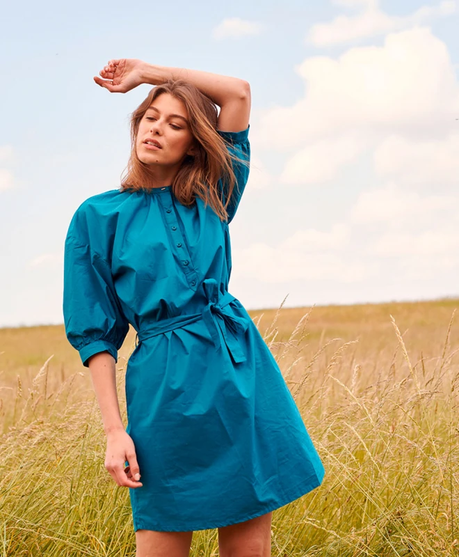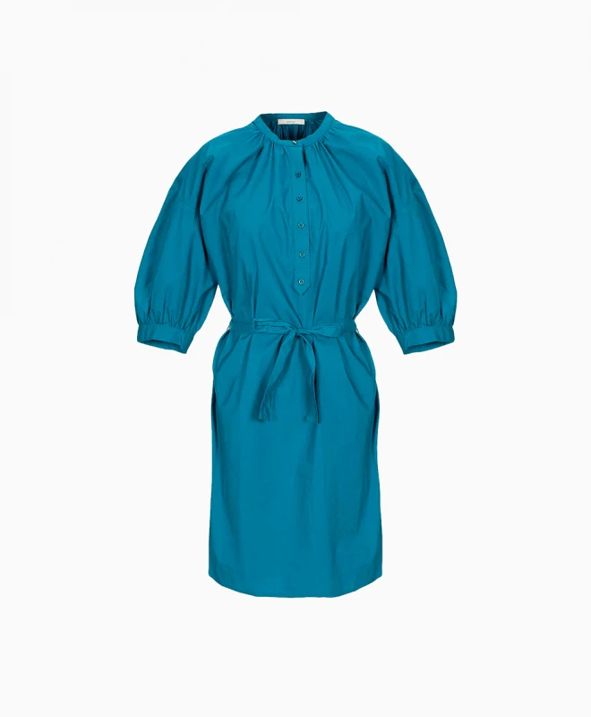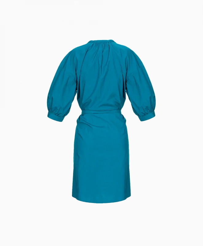 Robe Sessun, modèle Bleu pétrole. La robe à manches courtes, avec une fermeture à l’avant par une ceinture intégrée à nouer, est de couleur bleu pétrole. Son col mao associé à ses manches légèrement bouffantes ainsi que son coloris original en font une robe alliant élégance et simplicité. Un modèle que vous pourrez louer pour le bureau ou le week end.