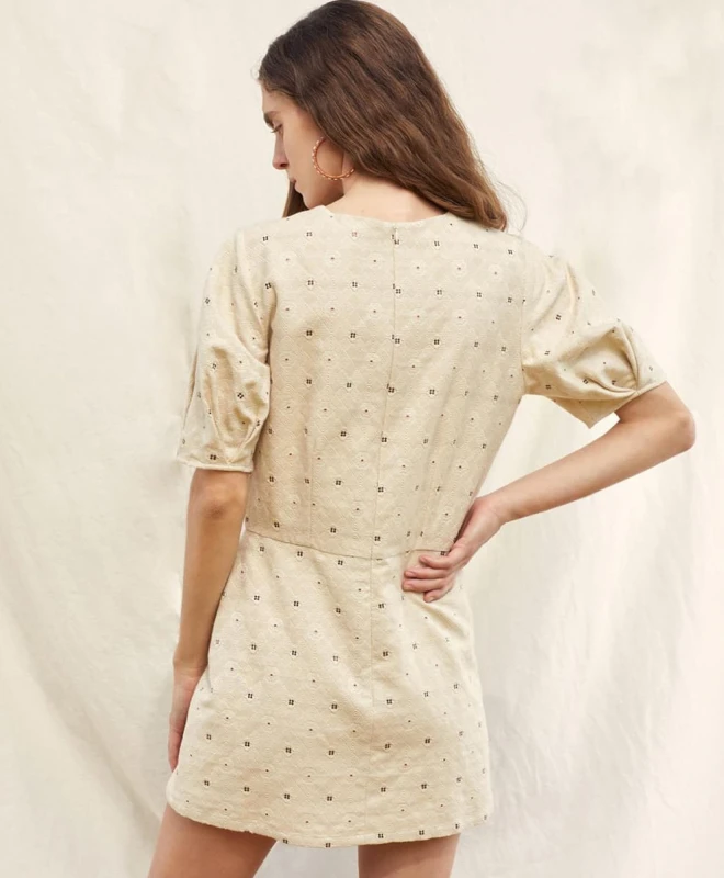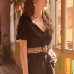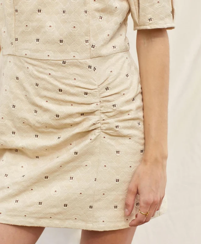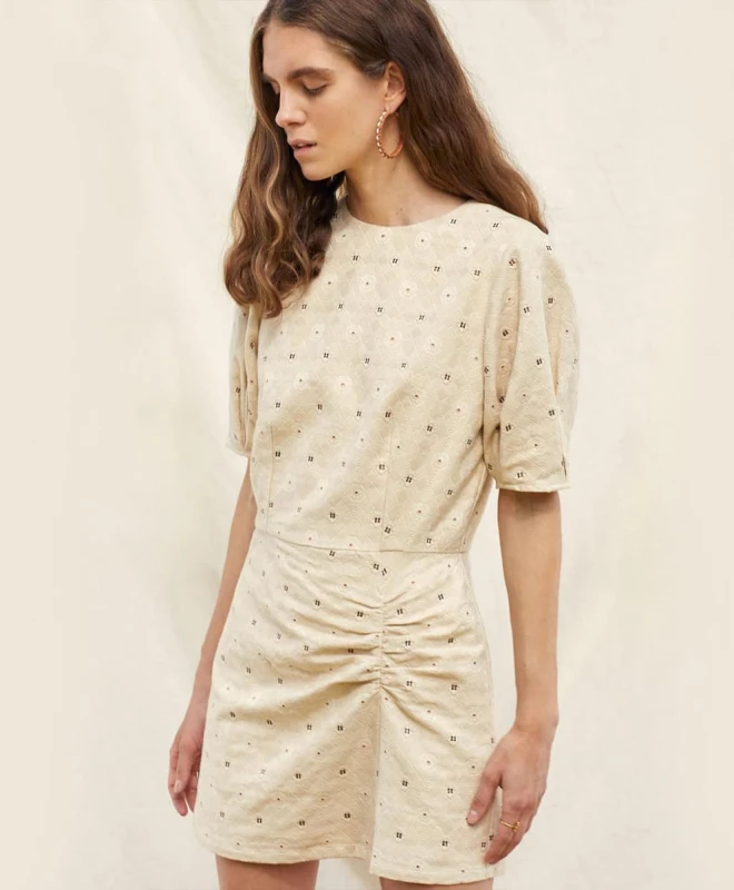 Robe Sessun, modèle Messine. Cette robe courte possède de manches 3/4 légèrement bouffantes et un col rond. Originale grâce au détail froncé sur la jupe, elle sera parfaite dans votre dressing ! Cette robe Sessun est disponible à la location par abonnement Une Robe Un soir et à la location à l’unité.