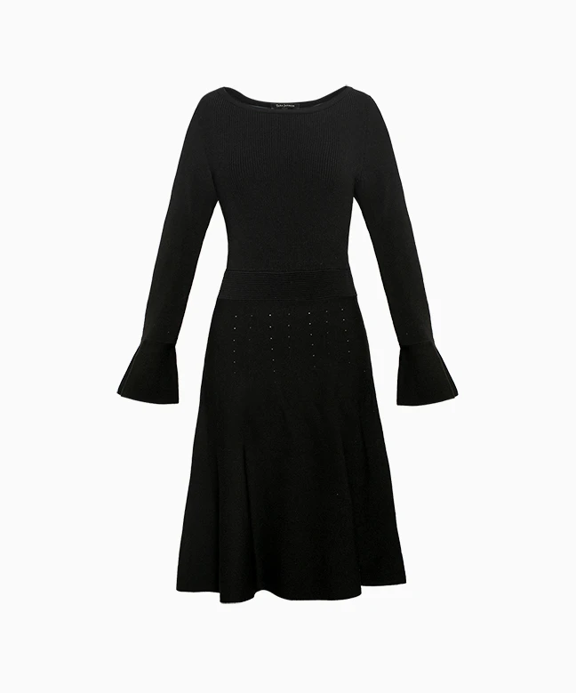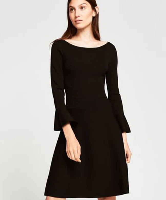 Robe TARA JARMON modèle Jasmine. Cette robe courte en maille avec une coupe patineuse, un col rond et les manches longues évasées aux poignets est signée Tara Jarmon.