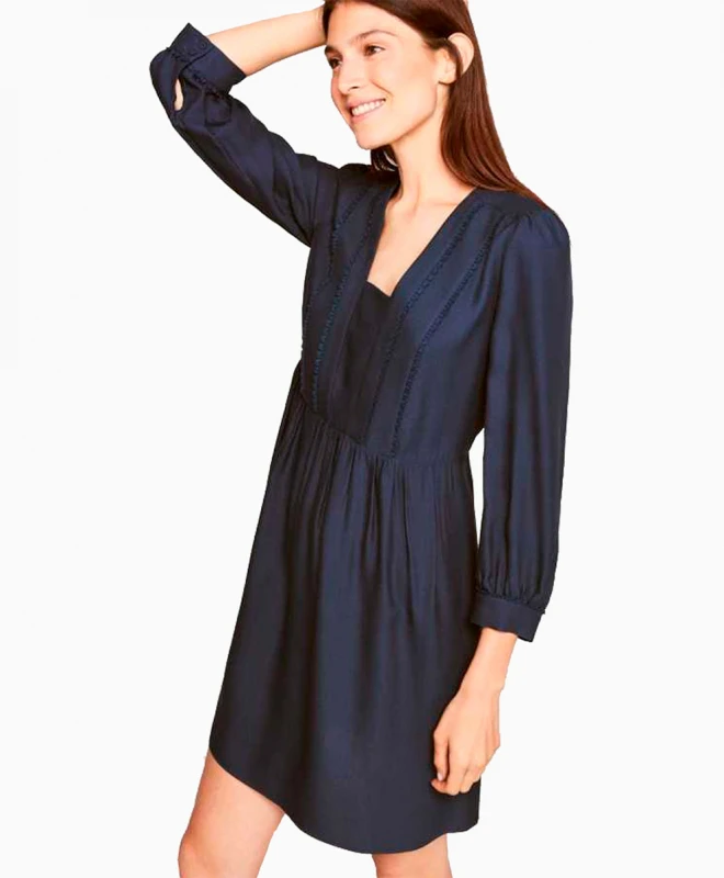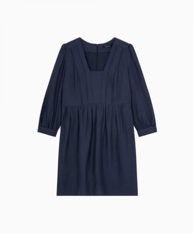 Robe TARA JARMON modèle Maisa. Cette petite robe de couleur indigo provient de la collection de Tara Jarmon. Elle présente une encolure carré, une forme ajustée à la taille et plus fluide vers le bas de robe. Silhouette épurée et féminine, c’est une robe qui conviendra aux adeptes des coupes fluides et élégantes. Une robe à louer pour son vestiaire d’automne.