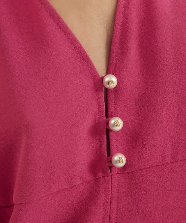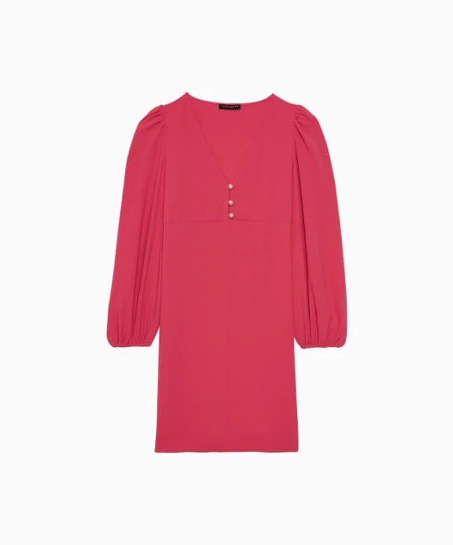 Robe Tara Jarmon, modèle Rolis Fuchsia. Cette jolie robe courte possède une coupe droite. Elle est dotĂ©e de manches longues bouffantes et resserrĂ©es au niveau des poignets. Les Ă©paules sont lĂ©gèrement surĂ©levĂ©es grâce Ă des dĂ©tails froncĂ©s. La robe dispose d’un dĂ©colletĂ© V prolongĂ© par une boutonnière nacrĂ©e pour donner une touche de brillance Ă la robe. Cette jolie robe est lĂ©gèrement cintrĂ©e et viendra mettre votre silhouette en valeur ! Cette robe Tara Jarmon est disponible Ă la location par abonnement Une Robe Un Soir et Ă la location Ă l’unitĂ©.