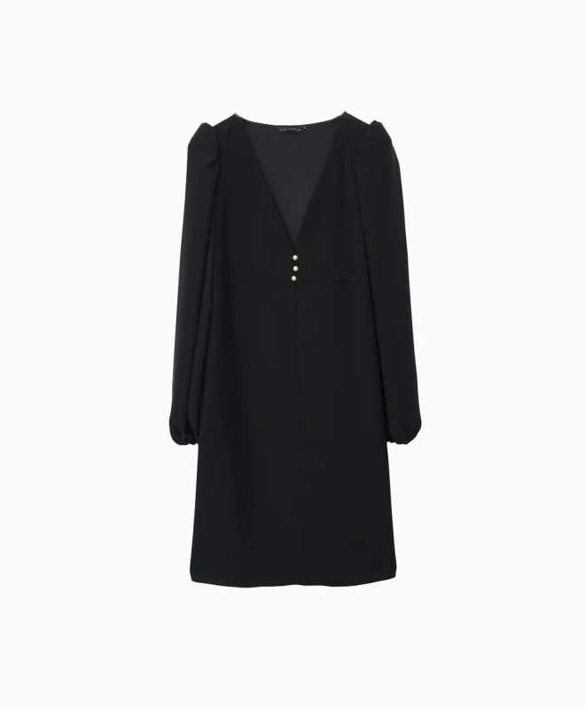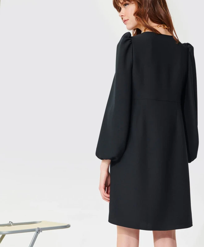 Robe Tara Jarmon, modèle Rolis. Cette robe droite possède deux manches longues ballons resserrés par un élastique au poignet. Elle est légèrement cintrée et dotée d’un col V qui mettra en valeur votre buste. La robe dispose d’une boutonnière sur le devant. Elle tombe au-dessus du genou. Cette robe Tara Jarmon est disponible à la location par abonnement Une Robe Un Soir et à la location à l’unité.