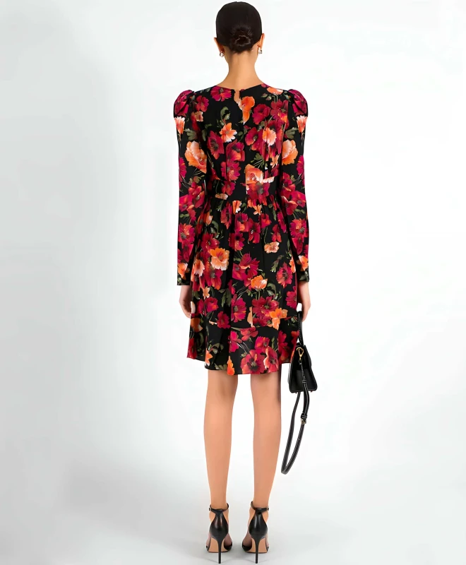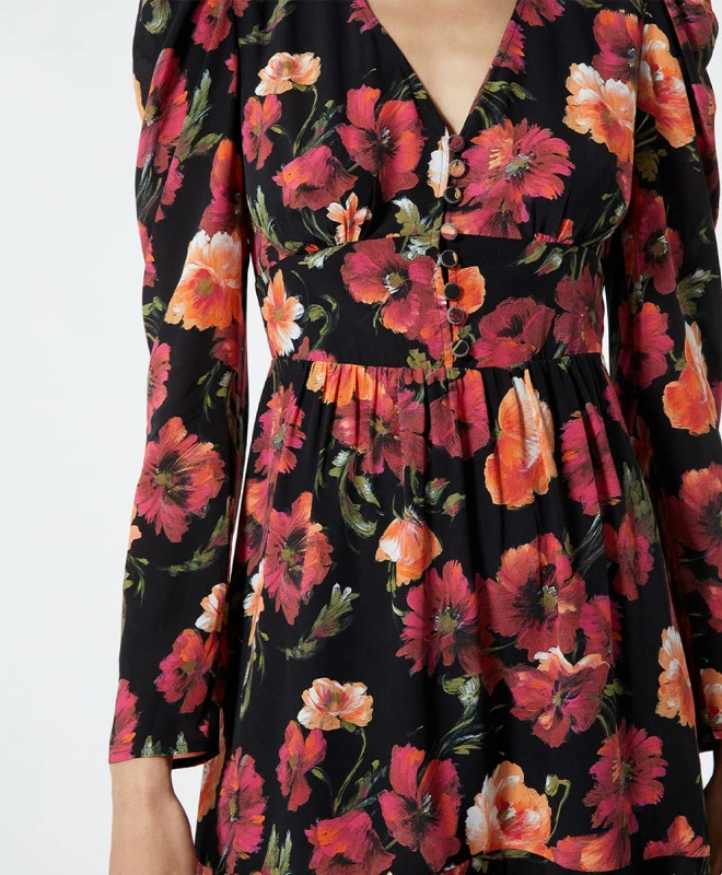 Robe The Kooples, modèle Mini Flower Power. Cette jolie robe présente une coupe ajustée à manches bouffantes. La jupe de la robe dispose de volants. Doté de petits boutons recouverts sur le devant, le modèle s’habille d’un motif fleuri orangé. Cette robe The Kooples est disponible à la location par abonnement Une Robe Un Soir et à la location à l’unité.