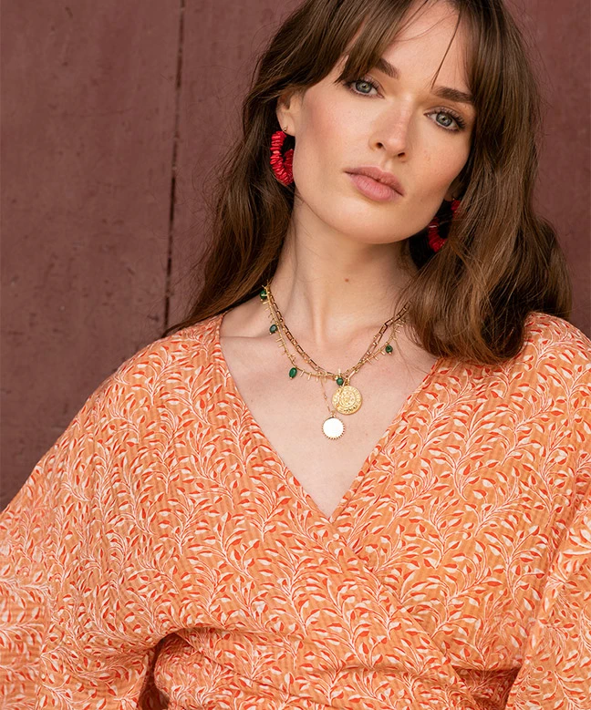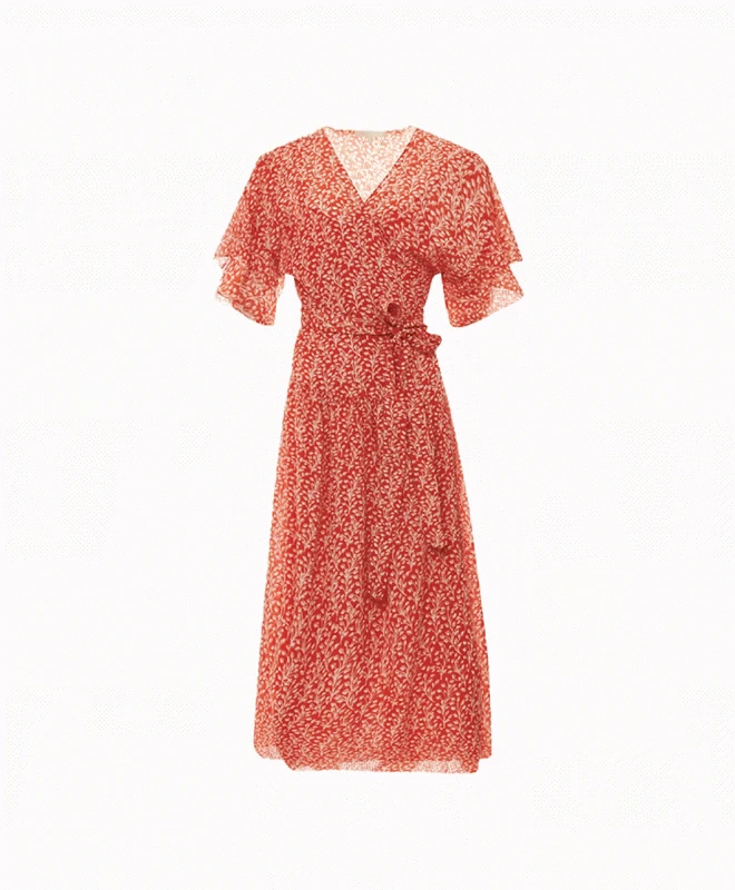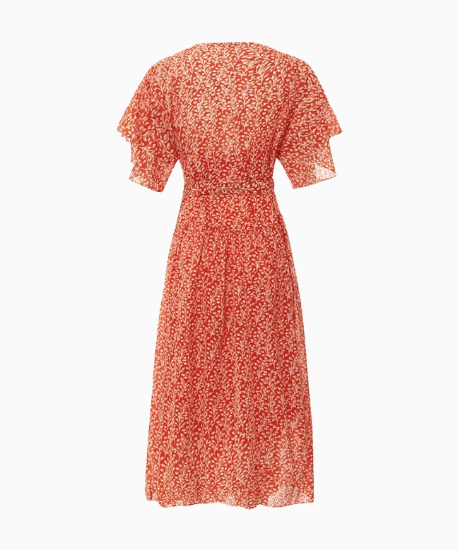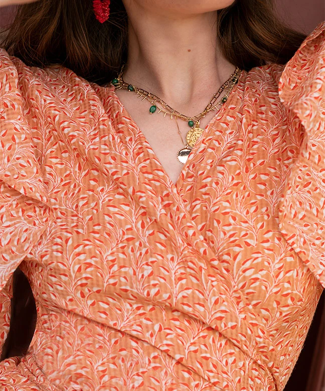 Robe Vanessa Bruno Modèle Lolita Corail. Cette robe longue couleur corail dispose d’une forme portefeuille : elle s’attache avec un noeud afin de cintrer votre taille et d’affiner votre silhouette. Elle possède un col en V et de manches courtes volantées. Elle est ornée de motifs fleuris ton sur ton. Accessoirisez-la avec un joli sac pour un look simple et élégant. La robe est disponible à la location unitaire ou par abonnement.
