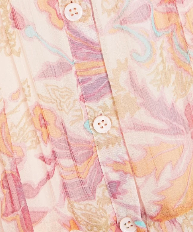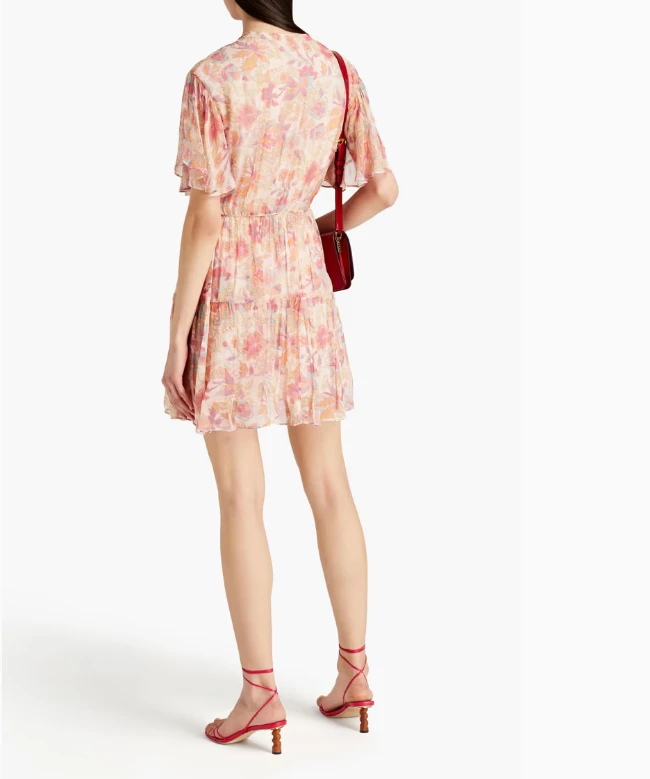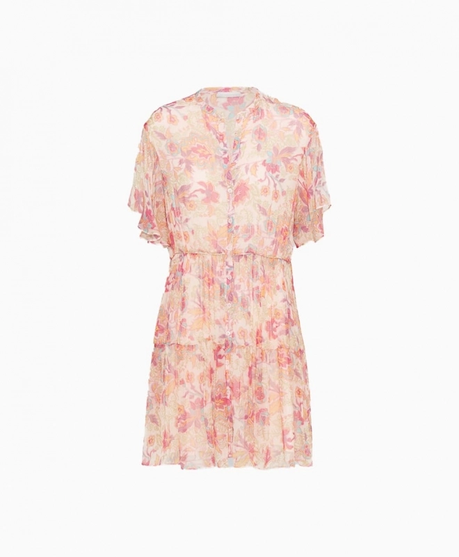 Robe Vanessa Bruno, modèle Rio Rose. Cette robe courte en georgette creponnée possède de manches courtes et un col rond. Elle est cintrée à la taille et la jupe de la robe est évasée et volantée vers le bas. Associez-la à des espadrilles pour élever votre look de la journée à la soirée. Cette jolie robe Vanessa Bruno est disponible à la location par abonnement à la box Une Robe Un soir et à la location à l’unité.