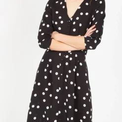 Robe WALLIS modèle Flippy Hem. Cette robe courte est de couleur noire avec des motifs à pois blancs. Le col de la robe est rond et les manches sont longues. Sa coupe est droite et dispose d’une couture en banc de la robe pour donner un aspect volant. La robe sera parfaite pour vos sorties et soirées que ça soit dehors ou au bureau. La robe est disponible à la location grâce à l’abonnement au Gang By RS dans lequel vous pourrez ajouter deux pièces supplémentaires à votre dressing.