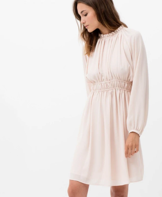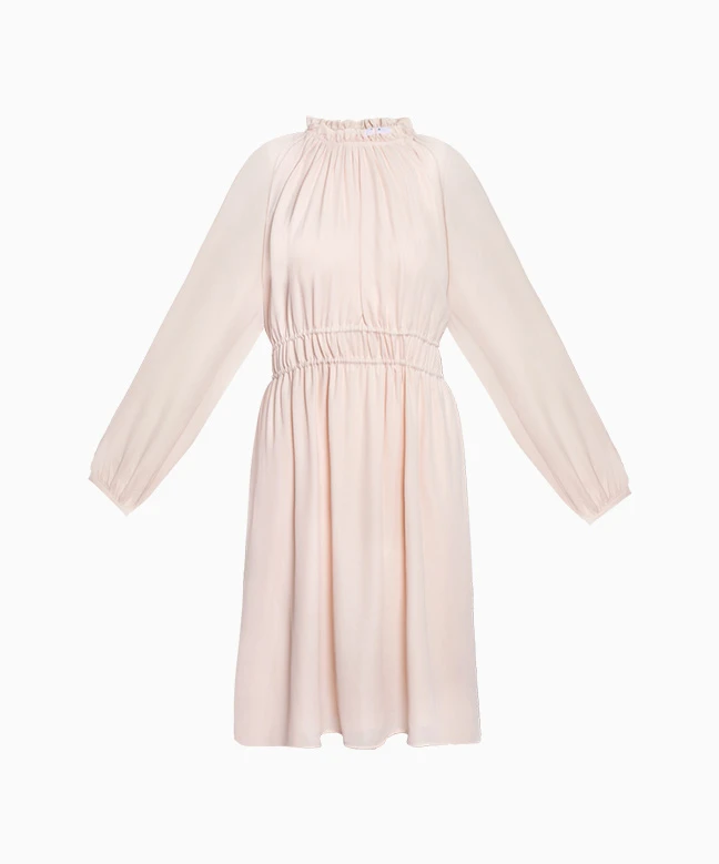 Robe Zapa modèle Randa. Cette robe dispose d’une jolie couleur rose pâle nude idéale pour mettre en valeur votre teint hâlé d’été. Elle dispose d’un col rond volanté et de manches longues amples resserrées aux poignets. Elle est ajustable à la taille grâce à des cordons amovibles. Sa matière est légère, vous pouvez la porter de jour comme de nuit, à un événement chic tout comme lors d’une simple journée à la plage ou en ville. La robe Zapa est disponible à la location grâce à votre abonnement Une Robe Un Soir et à la location unitaire.